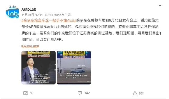 對此,自媒體“AutoLab 汽車(chē)實(shí)驗室”發(fā)文稱(chēng),余承東在成都車(chē)展和 9 月 12 日發(fā)布會(huì )上,引用的絕大部分 AEB 數據來(lái)自 AutoLab,包括鏡頭的拍攝。同時(shí)喊話(huà)小鵬及其他品牌車(chē)主:“帶著(zhù)你們的車(chē)來(lái)我們的測試基地,我們現場(chǎng)測,每月拿出 1 周時(shí)間專(zhuān)門(mén)測 AEB。”