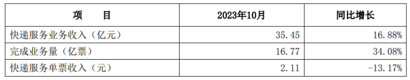申通快遞發(fā)布 10 月經(jīng)營(yíng)簡(jiǎn)報,快遞服務(wù)業(yè)務(wù)收入 35.45 億元,同比增長(cháng) 16.88%;完成業(yè)務(wù)量 16.77 億票,同比增長(cháng) 34.08%;快遞服務(wù)單票收入 2.11 元,同比下降 13.17%%。