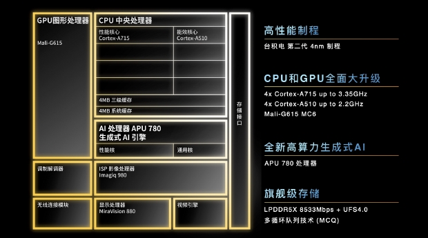 天璣8300在同級產(chǎn)品中率先支持生成式AI,至高支持100億參數AI大語(yǔ)言模型。該芯片集成MediaTek AI 處理器 APU 780,搭載生成式AI引擎,整數運算和浮點(diǎn)運算的性能是上一代的 2 倍,支持Transformer算子加速和混合精度INT4量化技術(shù),AI綜合性能是上一代的3.3倍,可流暢運行終端側生成式AI的創(chuàng )新應用。
