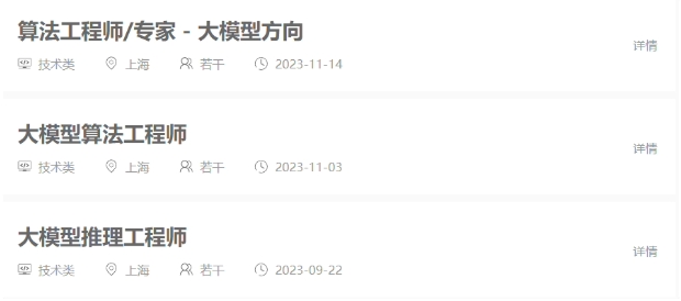 其中,一個(gè)名為“大模型算法”的職位下面介紹稱(chēng):要求對對 LLM、多模態(tài)、多語(yǔ)言有深入理解和實(shí)踐,在模型預訓練、性能調優(yōu)、內容生成方向有實(shí)際應用或項目經(jīng)驗;熟悉常見(jiàn)的深度學(xué)習算法,如 LSTM、Bert 等,熟悉 TenserFlow、PyTorch、Keras、MxNet 等。