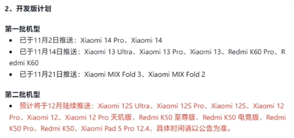 根據此前官方公布的發(fā)版計劃,Xiaomi 12S Ultra、Xiaomi 12S Pro、Xiaomi 12S、Xiaomi 12 Pro 天璣版、 Xiaomi 12 Pro、Xiaomi 12、Redmi K50 至尊版、Redmi K50 電競版、Redmi K50 Pro、Redmi K50、Xiaomi Pad 5 Pro 12.4 等機型預計 12 月推送澎湃 OS 開(kāi)發(fā)版。