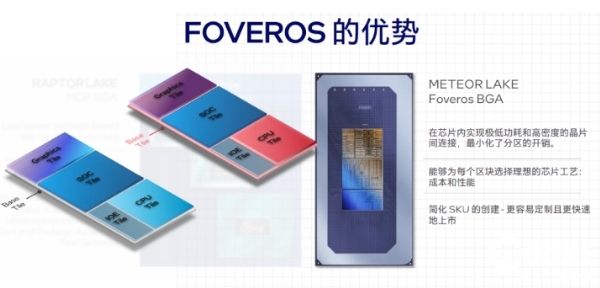 這么多模塊,如何才能高效封裝在一起?Foveros 3D封裝技術(shù)就該出場(chǎng)了,以往這個(gè)封裝技術(shù)多是用在服務(wù)器端,或者是應用于高密度計算的GPU端以及FPGA上。Meteor Lake是英特爾首次大規模采用新的Foveros先進(jìn)封裝技術(shù)用于消費市場(chǎng)產(chǎn)品。
