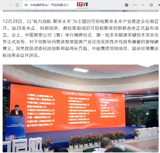 據中國核工業(yè)集團有限公司(簡(jiǎn)稱(chēng)中核集團)官網(wǎng)消息,12 月 29 日,以“核力啟航 聚變未來(lái)”為主題的可控核聚變未來(lái)產(chǎn)業(yè)推進(jìn)會(huì )在蓉召開(kāi)。由 25 家央企、科研院所、高校等組成的可控核聚變創(chuàng )新聯(lián)合體正式宣布成立。會(huì )上,中國聚變公司(籌)舉行揭牌儀式,第一批未來(lái)能源關(guān)鍵技術(shù)攻關(guān)任務(wù)正式發(fā)布,對于創(chuàng )新協(xié)同推進(jìn)聚變能源產(chǎn)業(yè)邁出實(shí)質(zhì)性步伐具有重要的里程碑意義。