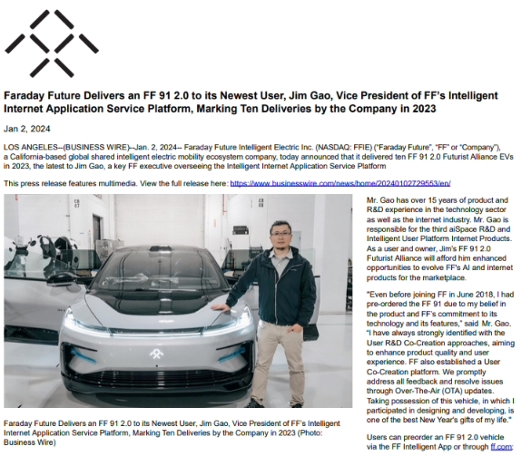 法拉第未來(lái)今日宣布,已經(jīng)向智能網(wǎng)聯(lián)應用平臺全球副總裁 Jim Gao 交付了一輛 FF 91 2.0,這標志著(zhù)該公司在 2023 年已經(jīng)交付了十輛車(chē)。