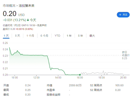 值得一提的是,法拉第未來(lái)在 12 月 28 日收到了納斯達克關(guān)于退市或不符合繼續上市規則或標準的通知。法拉第未來(lái)美股為 0.20 美元,市值僅 2559.60 萬(wàn)美元。