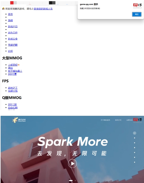 嘗試打開(kāi)騰訊游戲官網(wǎng),發(fā)現已經(jīng)無(wú)法顯示內容,彈窗顯示“抱歉,未找到對應的新聞”,頁(yè)面僅有“首頁(yè)”可以打開(kāi),點(diǎn)擊后跳轉至騰訊游戲介紹頁(yè)。