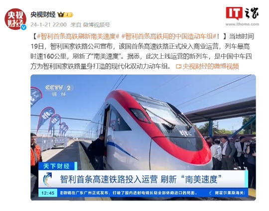 智利國家鐵路公司于當地時(shí)間 1 月 19 日宣布,該國首條高速鐵路正式投入商業(yè)運營(yíng),列車(chē)最高時(shí)速 160 公里,刷新了“南美速度”。據悉,此次上線(xiàn)運營(yíng)的新列車(chē),是中國中車(chē)四方為智利國家鐵路量身打造的現代化雙動(dòng)力動(dòng)車(chē)組。