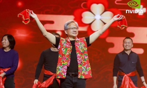 在年會(huì )上黃仁勛還展示了其另外一面:脫掉了黑色皮夾克,身穿東北特色大花襖,伴隨著(zhù)歡快的音樂(lè ),轉動(dòng)紅色手帕,扭起了秧歌。