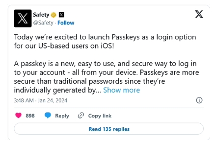 X(推特)為了提高賬號安全性,近日發(fā)布公告,宣布添加對 Passkey 的支持,不過(guò)目前僅限于美國 iPhone 用戶(hù),后續會(huì )擴展到安卓平臺以及更多國家和地區。