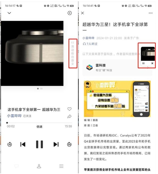 如果想從文章返回音頻播放器,操作也很方便,只需要點(diǎn)擊文章上方音頻懸浮窗就OK了。