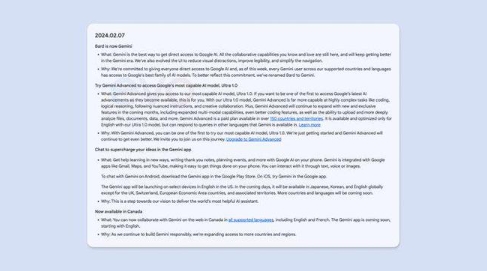 根據文件,Gemini Advanced 將允許用戶(hù)訪(fǎng)問(wèn) Gemini 的 Ultra 1.0 模型,該模型在“編碼、邏輯推理、遵循細致指令和創(chuàng )意協(xié)作等高度復雜任務(wù)方面表現出色”。其初期版本將在超過(guò) 150 個(gè)國家 / 地區提供,并針對英語(yǔ)進(jìn)行優(yōu)化。文件還顯示,Gemini 將隨此次更新擴展到加拿大地區。