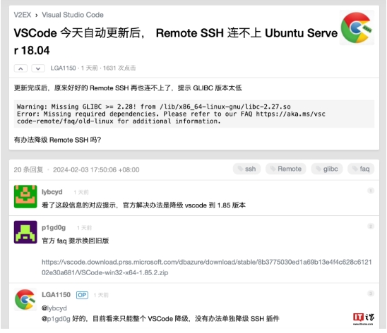日前有網(wǎng)友發(fā)帖詢(xún)問(wèn),在安裝了 VS Code 自動(dòng)更新后,遠程開(kāi)發(fā)服務(wù)器 Remote SSH 連不上 Ubuntu Server 18.04,評論區指出這是由于 Ubuntu 18.04 LTS 等舊版本 Linux 發(fā)行版使用 glibc 2.27,因此在更新 VS Code 1.86 后便無(wú)法連上。