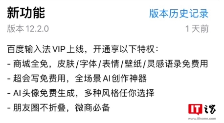 百度輸入法 12.2.0 版更新上線(xiàn)“VIP 權益”:22.8 元 / 月,可使用商城付費內容及 AI 功能