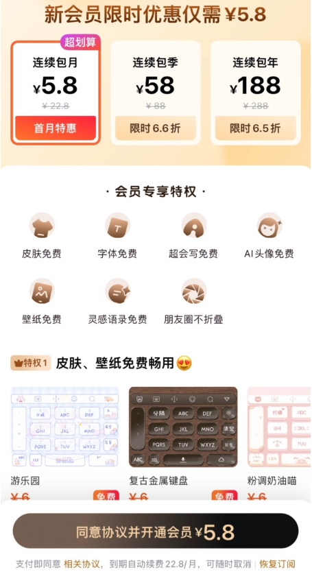 百度輸入法昨日推送了 12.2.0 版本更新,主要上線(xiàn)了“百度輸入法 VIP”,號稱(chēng)擁有皮膚字體免費等特權,連續包月“首月特惠”5.8 元,之后每個(gè)月需要支付 22.8 元訂閱費。