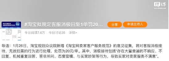 今日“淘寶擬規定客服消極回復 1 單罰 20 元”話(huà)題在微博引起熱議,目前相關(guān)話(huà)題閱讀量 7.6 萬(wàn)。