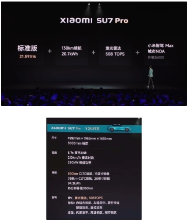 小米 SU7 Pro 版在標準版基礎上增加了 20.7kWh 電池、激光雷達、小米智駕 Max,售價(jià) 24.59 萬(wàn)元。