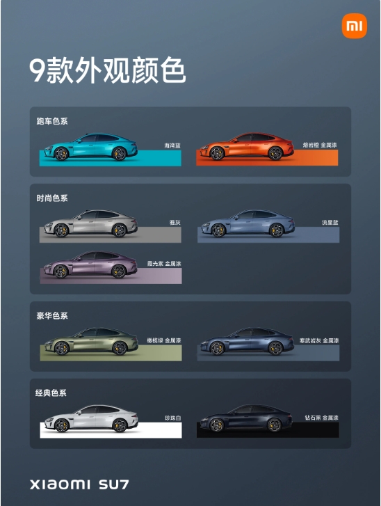 小米 SU7 提供 4 大色系共 9 種顏色,分別是:海灣藍、熔巖橙、雅灰、流星藍、霞光紫、橄欖綠、寒武巖灰、珍珠白、鉆石黑。