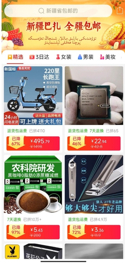 今年3月,拼多多也在新疆地區推行免費“包郵”送貨進(jìn)村,已在全疆超一半的村域開(kāi)通。