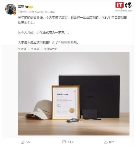 剛剛小米集團董事長(cháng)雷軍在微博發(fā)文稱(chēng),“三年前的豪言壯語(yǔ),今天變成了現實(shí),我會(huì )將一臺臺嶄新的小米 SU7 親自交到首批車(chē)主手上。從今天開(kāi)始,小米正式成為一家車(chē)廠(chǎng)。大家是不是應該叫我雷廠(chǎng)長(cháng)了?哈哈哈哈哈。”