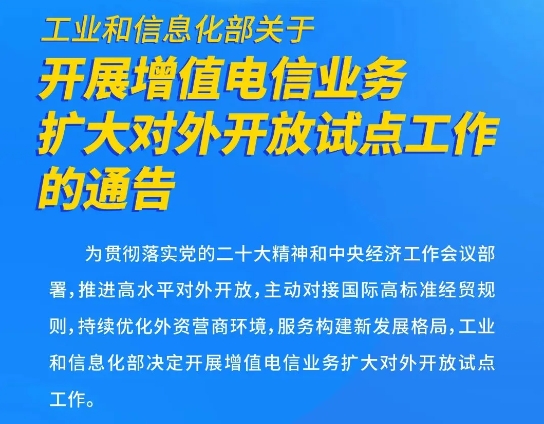 工業(yè)和信息化部近日發(fā)布通告,部署開(kāi)展增值電信業(yè)務(wù)擴大對外開(kāi)放試點(diǎn)工作。
