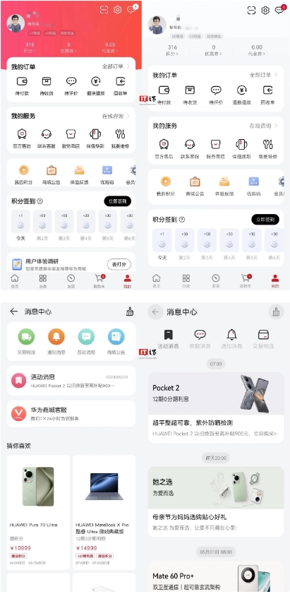 華為商城 App 在部分頁(yè)面 UI 做出了調整,更新前后對比圖(左舊右新)如下: