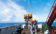 7月8日,向陽(yáng)紅10號,科研人員將無(wú)人潛器吊運入海。新華社發(fā) 連日來(lái),在蔚藍色的南海北部,我國科研人員在向陽(yáng)紅10號科考船上,